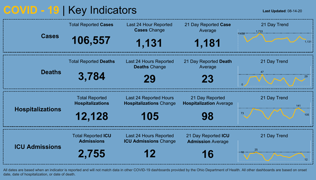 While I like that little dip at the end of the line charts, the looking at the numbers might provide more context. The number of cases are indeed below the 21 day average, supporting Governor DeWine’s’ message, but the hospitalization and mortality rates have an uptick.