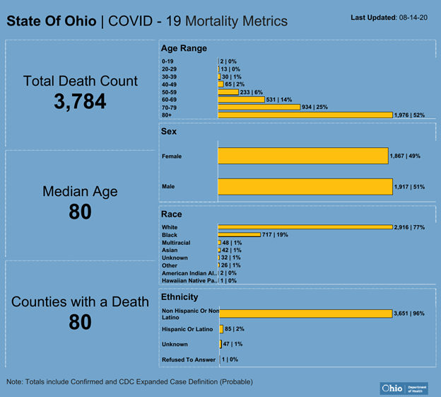 According to the worldpopulationreview.com, of Ohio’s population of 11,747,700, 82% is white and 12% is black or African American. Using this data, the mortality rate of COVID-19 related deaths is .031% within the white population and .050% within the black and African American population, showing the latter more at risk.