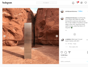 - Ten foot tall monolith found in remote area of a Utah desert by government team surveying bighorn sheep populations. Contrary to the news stories, this is not just like 2001: A Space Odyssey. The one is the movie is black.